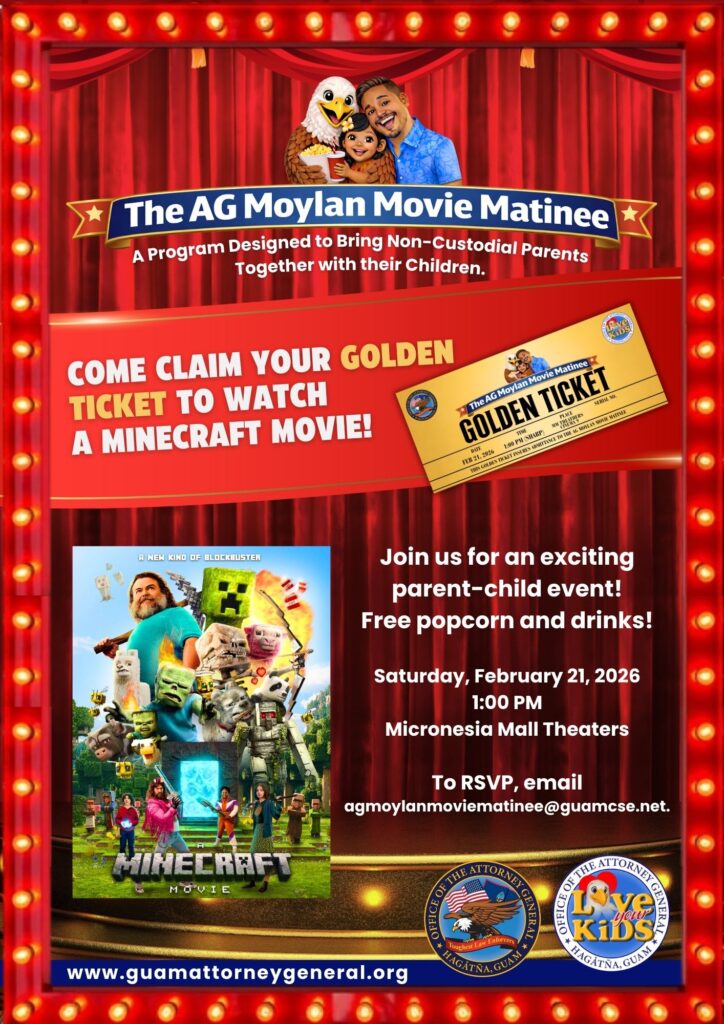 With the AG Moylan’s “Golden Ticket,” NCPs take photos with their children in a photo booth, a chance to interact with each other enjoying popcorn and their favorite beverages watching A Minecraft Movie, and interacting with an afternoon of fun games at the Micronesia Mall. Please visit our website at www.guamattorneygeneral.org for more information on this first of its kind event intent upon strengthening bonds between NCPs and their children.